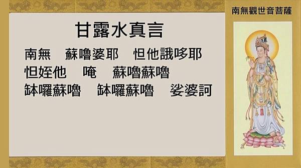 真言就是咒語的意思。佛典記載三惡道的眾生,看到水就好像看到膿血一樣。透過甘露真言的加持,讓這些像膿血的水,變成清淨甘露;飲後身得清涼,心無貪瞋癡,一切惡道眾生皆能離苦得樂。