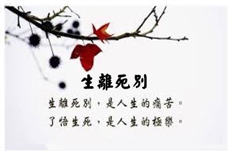 示:「日出、日落、月盈、月虧、花開、花謝、春耕、夏播、秋收、冬藏」,乃大自然法則循環之定律,反映著人生「生、老、病、死」之輪迴。唉!「生離死別」,何嘗不是人生旅途中,最感美中不足之遺憾!正當吾人打拼一生欲享受人倫圓滿、兒孫滿堂之刻而忽然死;夫妻恩愛濃時而倏忽離,印證了人生「生來死去」之不誣。儘管如此,芸芸眾生又有幾人眼見人生世態無常能有所了悟者也!