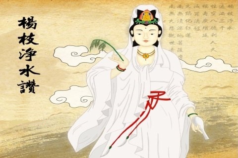 楊枝淨水,遍灑三千:觀世音菩薩手持楊柳枝沾灑甘露水,以菩薩的無邊悲願,將清涼淨水灑遍三千大千世界,利益無數眾生。