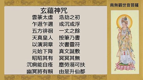 玄元一氣,無極之先,太始太乙,含象九天,開明三境,萬化大千,至今治御,統承前賢,三才合德,九氣同元,消除災劫,普度群仙,誦之萬遍,福祿綿延,吉祥萃泰,永保遐年,謹遵普化,道德成全。