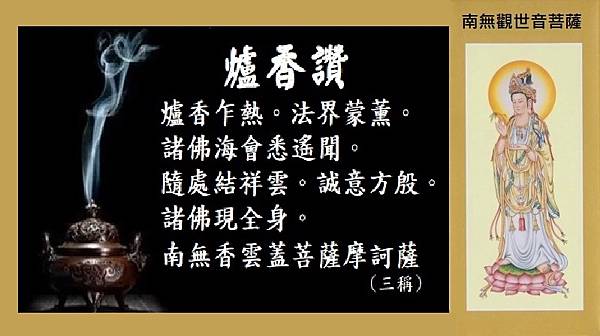 爐香乍爇。法界蒙薰。諸佛海會悉遙聞。隨處結祥雲。誠意方殷。諸佛現全身。