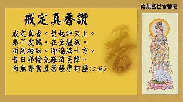 戒定真香。焚起沖天上。弟子虔誠。爇在金爐放。頃刻紛紜。即遍滿十方。昔日耶輸免難消災障。